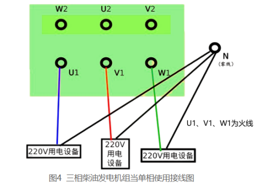 ●單相負(fù)載需均勻分配到各相,接線方法如圖4所示,避免三相不平衡(可能導(dǎo)致發(fā)電機(jī)過熱或電壓波動)。