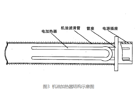 康明斯公司生產(chǎn)的機油電加熱器結(jié)構如圖3所示,主要是由機油濾清管及電加熱器構成,電加熱器固定在機油濾清管中,與電加熱器聯(lián)結(jié)在一起電源插座固定在機油濾清管的管座上。該柴油發(fā)電機機油電加熱器和現(xiàn)有技術相比,具有設計合理、結(jié)構簡單、易于加工、體積小、使用方便、省時省工省力等特點,而且對現(xiàn)有各種柴油發(fā)電機的形狀和性能產(chǎn)生任何影響。因而,具有很好的推廣使用價值。
